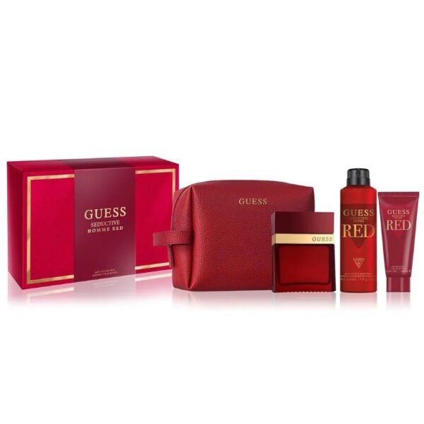 Склад набору: Туалетна вода Guess Seductive Red Homme – 100мл; дезодорант Guess Seductive Red Homme – 226мл; парфумований гель для душу Guess Seductive Red Homme – 100мл; туалетна косметичка.